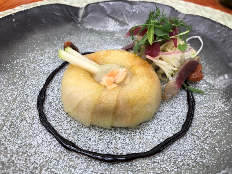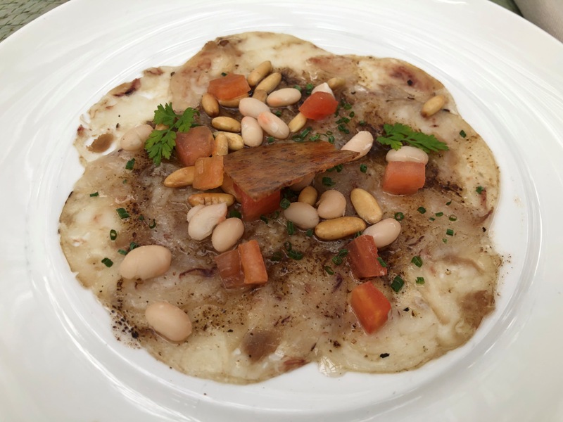 Carpaccio de manitas de cerdo, con judías de Santa Pau, aceite de boletus edulis y nougat de cebolla (1989)