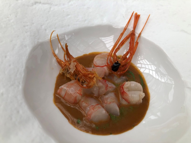 Gambas de Palamós con salsa y el caparazón deshidratado.