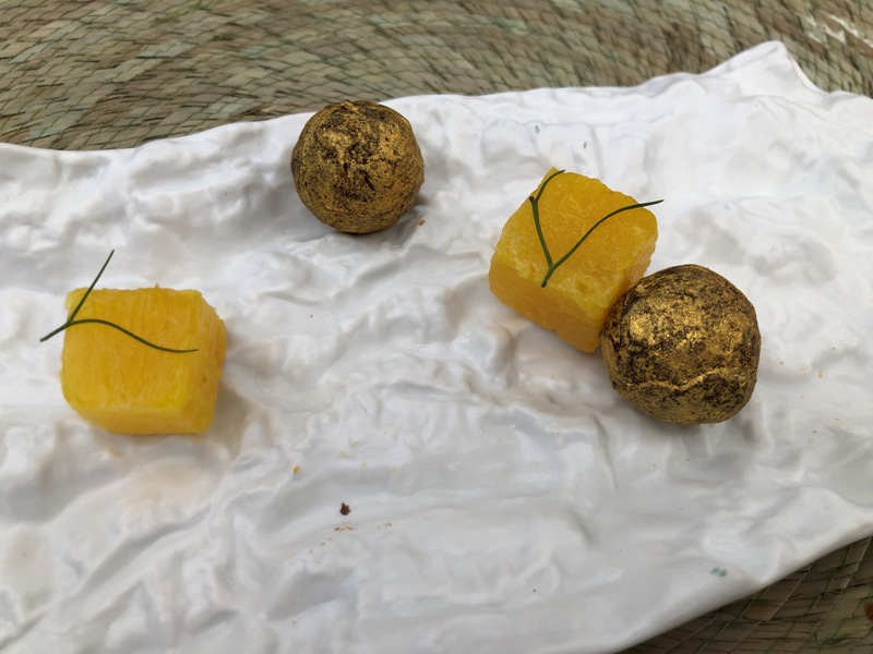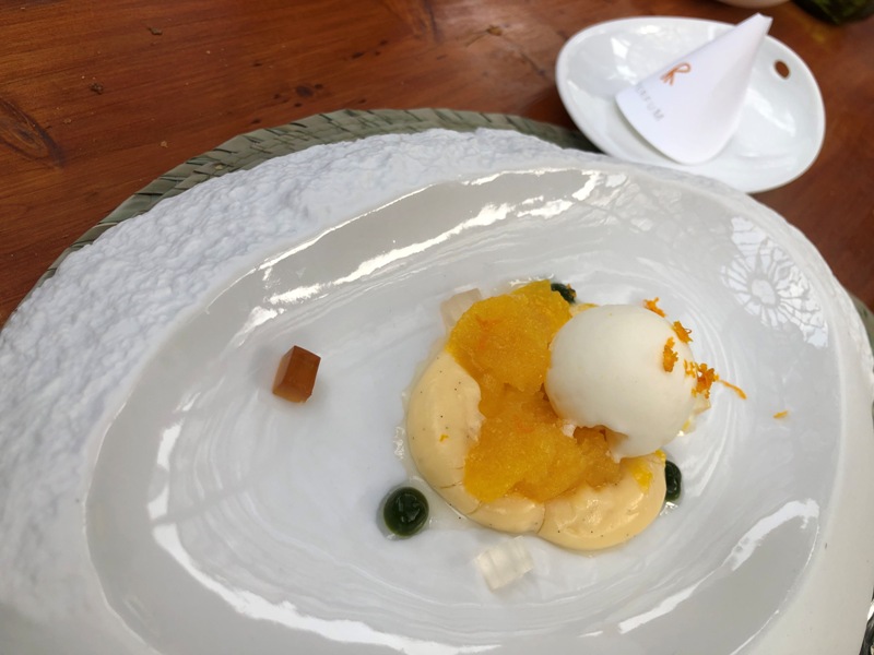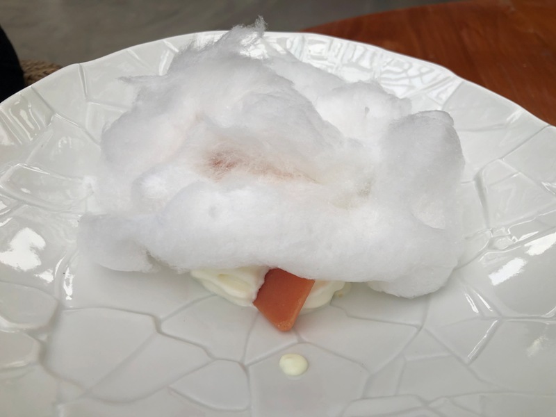 Postre láctico de dulce de leche de oveja, espuma de cuajada, helado de leche de oveja, gotas de yogur, granizado de guayaba y algodón de azúcar (2006), del cual nos explicaron es un homenaje a los pastores, si haces girar la cuchara mezclando los ingrediente en el plato suena como los cencerros que llevan los rebaños.