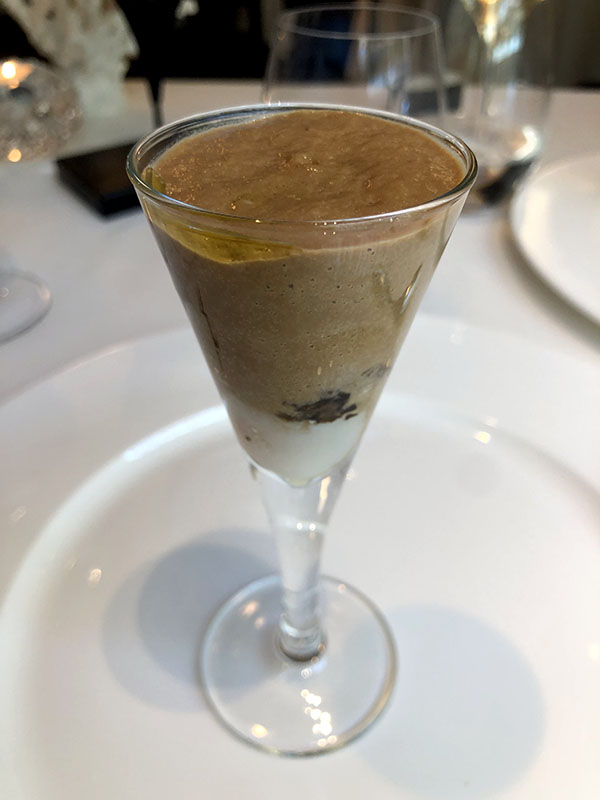 De snacks nos trajeron un sorprendente Cappuccino de berenjena ahumada y coco y unas tarrinas de croqueta de especias mediterráneas.