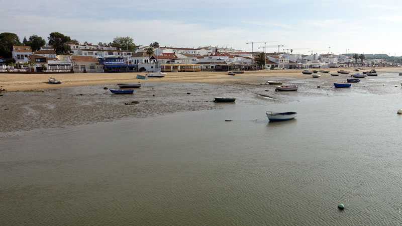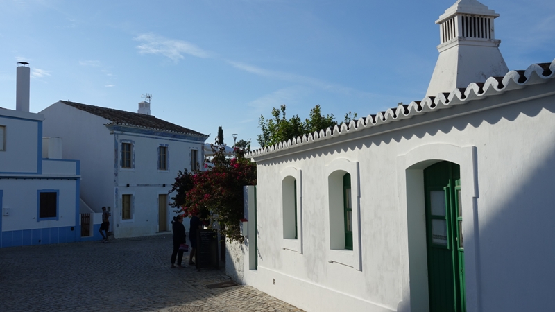 Como la población es bastante pequeña, tuvimos ciertas dificultades para aparcar, pero una vez lo conseguimos, pudimos recorrer el precioso pueblo que parece sacado de una postal, con sus casas pintadas en blanco y azul frente al Parque Natural de la Ría Formosa.
