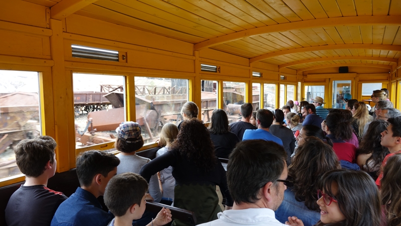 Una vez embarcamos en el encantador tren, con sus vagones de madera reconstruidos a partir de los planos del siglo XIX, iniciamos el recorrido hacia la mina, el recorrido es un auténtico espectáculo, recorriendo por zonas de tierras multicolores siempre acompañados por el río de aguas rojizas, es una parte del trazado original de la vía de 1875.