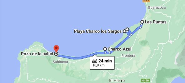 8 kilómetros mas al Oeste llegamos hasta el Pozo de la Salud, muy cerca de la Sabinosa, donde se encuentra el antiguo Hotel Balneario Pozo de la Salud. construido sobre el acantilado encima de la lavas, la cuales están asentadas sobre un substrato poco permeable que retiene el agua de lluvia lo que unido a la influencia del mar hacen que estas aguas mineromedicinales tengan muchas sales disueltas, dándoles propiedades terapéuticas .