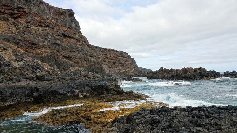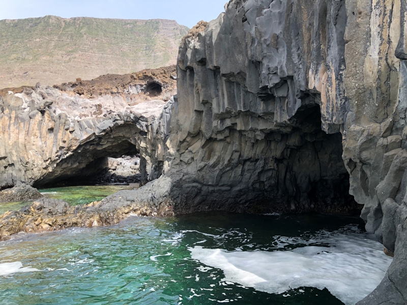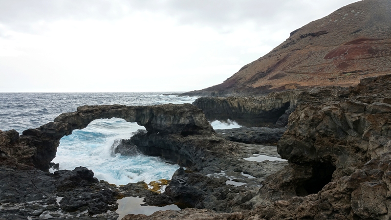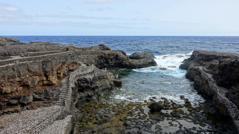 El Charco Azul es de los más famosos de la isla, una vez recorrimos los apenas 6 kilómetros que lo separan del Charco de los Sargos, aparcamos en su pequeño parking, para a continuación descender por una larga escalera apoyada en la ladera volcánica, que nos dejo frente a la piscina natural, lo más sorprendente de este charco es que está resguardado dentro de una bóveda basáltica dándole un encanto muy especial, al igual que los Sargos, sus aguas son de un precioso color turquesa intenso en los días soleados y muy tranquilas, en nuestro caso repetimos su visita un par de veces.