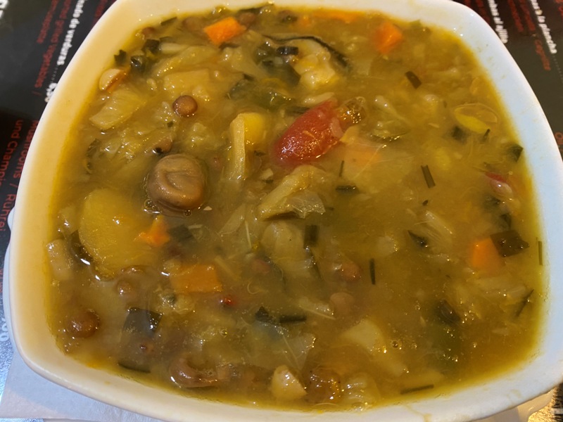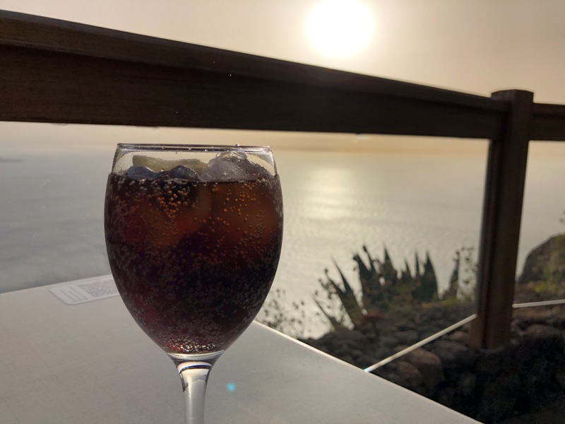 Al descender por la carretera desde el mirador decidimos cenar en el restaurante La Pasada en la población de Guarazoca, a pie de carretera. Si tenéis suerte que os pongan en una mesa al lado de la ventana disfrutareis de unas fantásticas vistas a la bahía, para comer elegimos una Piña natural con gambas, potaje canario y pollo plancha.