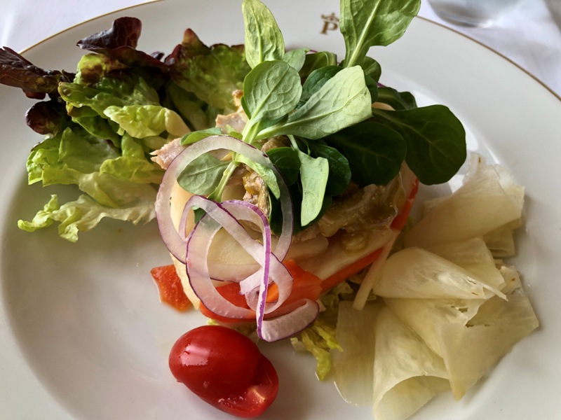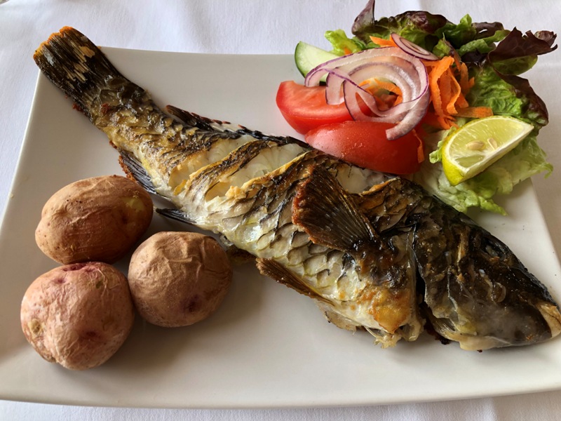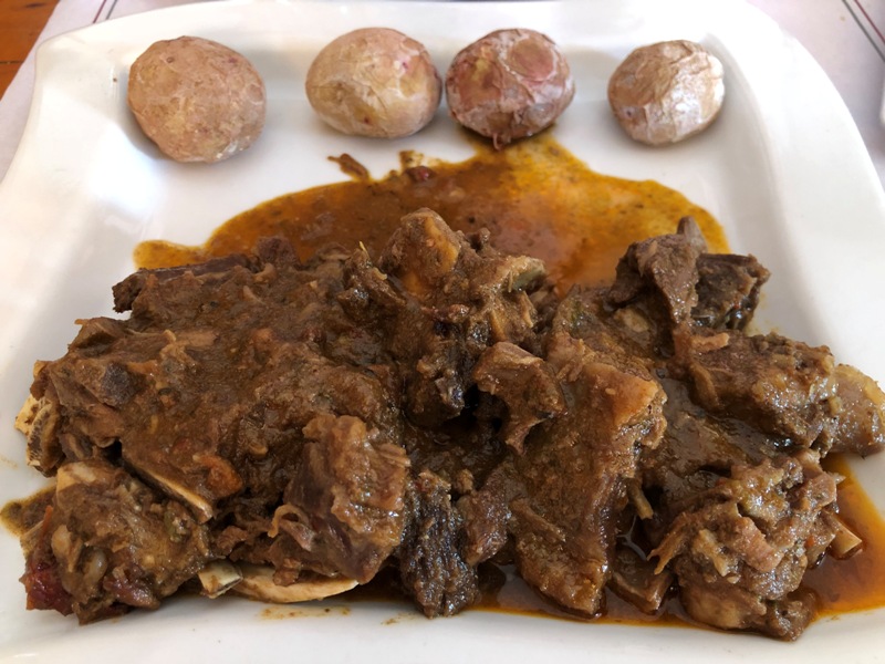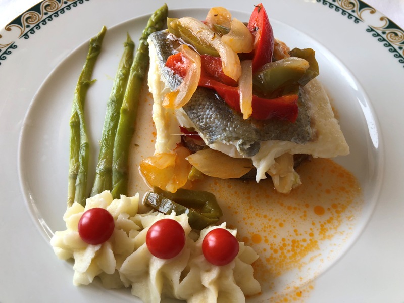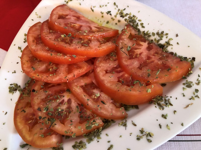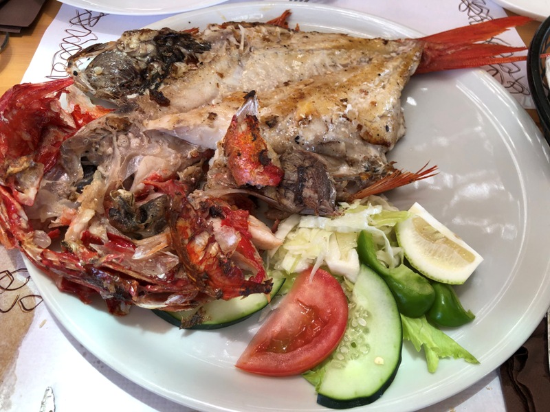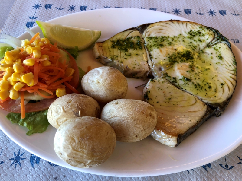 Elegimos para comer unos entrantes de primero y una Carne Fiesta, uno de los platos más populares de la cocina herreña a base de carne de cerdo adobada y un Peto a la plancha, que es otro pescado local que desconocíamos.