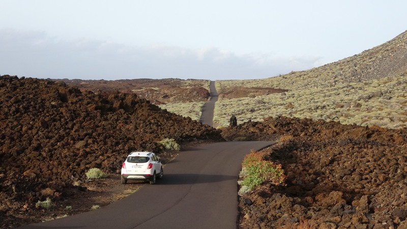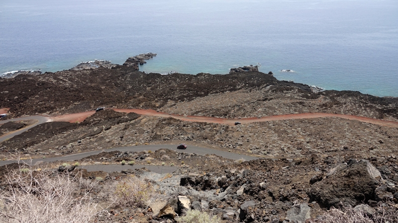 La carretera iba descendiendo hacia el mar con unas magnificas vistas de los cráteres volcánicos de color ocre, rodeados de un mar de lava que finaliza en unos negros acantilados sobre el océano.