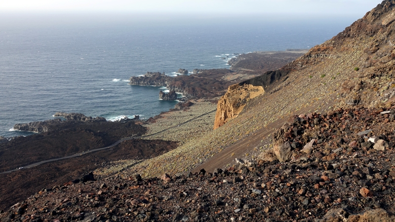 Para regresar a La Frontera lo hicimos por una revirada pero impresionante carretera que bordea la costa, descendiendo por enormes coladas de lava solidificada, un pasaje inhóspito que parece de otro planeta con el mar de fondo, a pesar de las innumerables curvas, el recorrido nos encantó, parando varias veces para fotografiarlo.