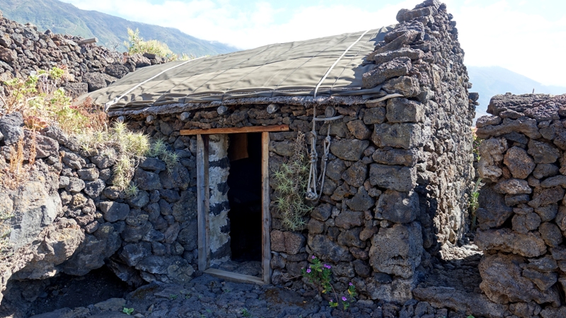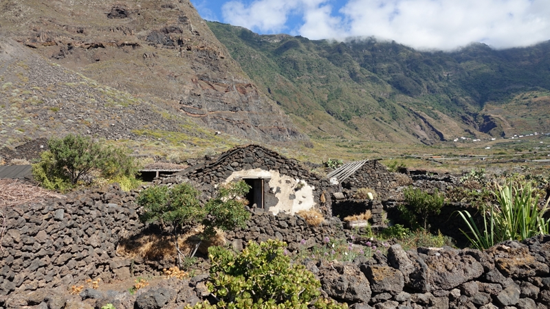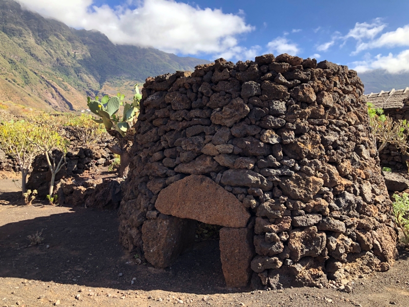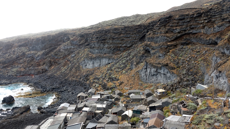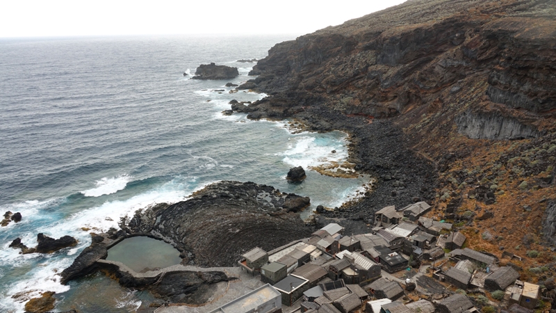 Iniciamos las visitas con el Pozo de las Calcosas, un pequeño pueblo creado por los pescadores para pasar la temporada de verano, donde pudimos observar varias construcciones ancestrales con tejados de colmo, el pueblo está ubicado bajo un acantilado de roca basáltica, si observáis la fotografía veréis que todavía se aprecia la forma de la lava proveniente del volcán de la Montaña de Aguarijo, solidificada formando pliegues al llegar a la orilla del mar, como si fuera un delta de lava y creando unas hermosas piscinas naturales.