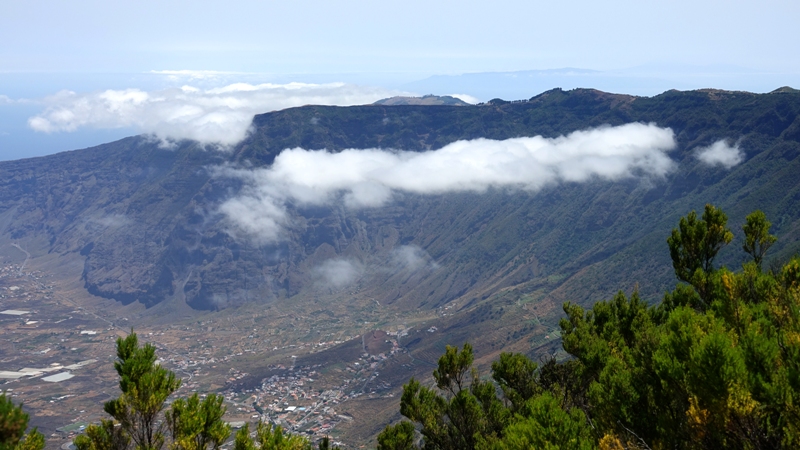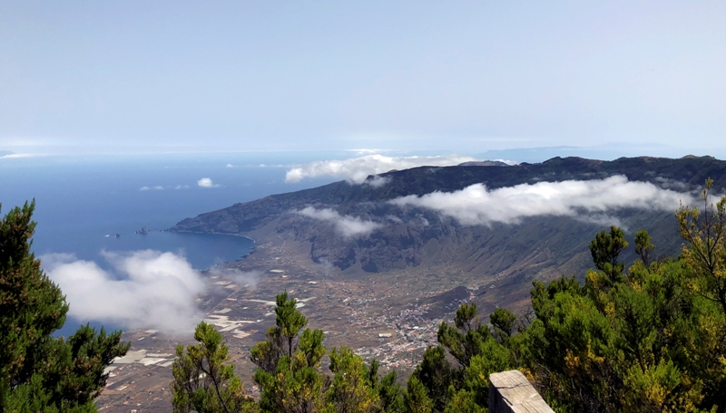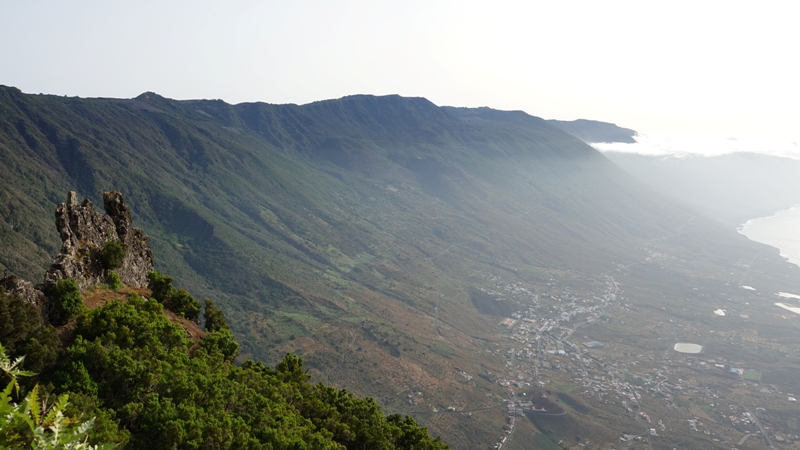 Muy cerca, siguiendo con el coche una pista forestal bien señalizada, nos encontramos con el Mirador de Bascos, situado en el extremo noroccidental de la isla, donde pudimos disfrutar de unas excelentes vistas del Valle del Golfo, siempre y cuando no baje la niebla claro, en nuestro caso tuvimos que esperar unos minutos para que aclarase un poco, pues cuando llegamos había bastante niebla, actualmente el promontorio esta medio cerrado por derrumbes, pero se pueden ver igualmente las vistas desde un lateral.