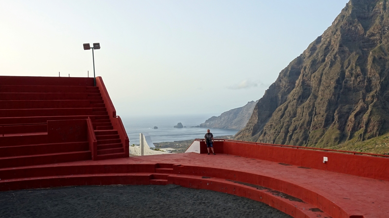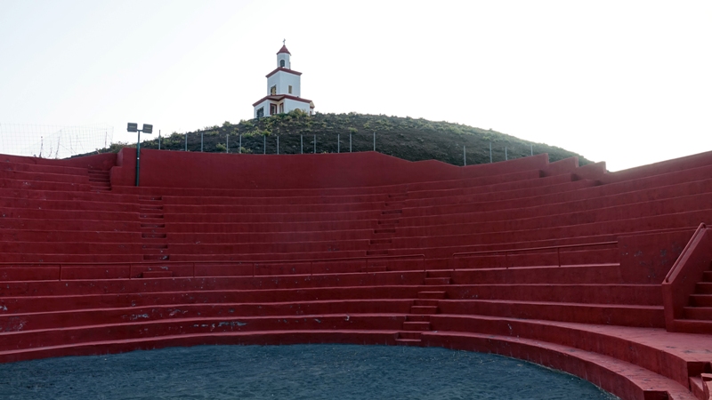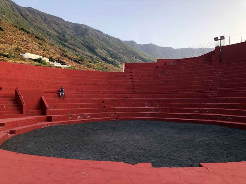 De paso entramos en el Campo de Lucha Canaria, donde los gladiadores actuales libran sus batallas en una arena de gradas color rojo. Siendo otra de la localizaciones que salen en la serie Hierro.
