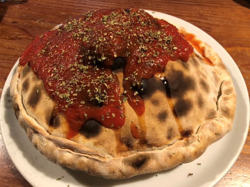 Elegimos para abrir boca, pan de ajo, una ensalada provenzal con queso herreño y para rematar la faena una explosiva pizza Volcano que nos dejó a reventar de lo grande que era.