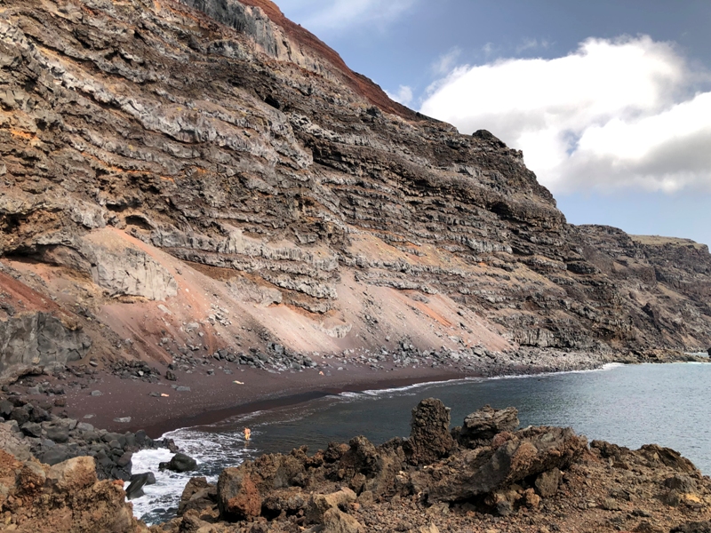 Sobre las cinco más o menos nos dirigimos hacia la Playa de Verodal , situada en el extremo más occidental de La Frontera, es una playa de arena “roja”, formada por el material volcánico que la roca desprende, como podéis ver en la foto, el paisaje es de una gran belleza con sus arenas rojas bajo el acantilado volcánico multicolor, el único inconveniente es que está prohibido el baño debido a las fuertes corrientes, aunque cuando llegamos había una pareja bañándose, a pesar de ello vale mucho la pena visitarla. Fue curioso el ver una playa de color rojo, la primera que vemos en las Islas Canarias.