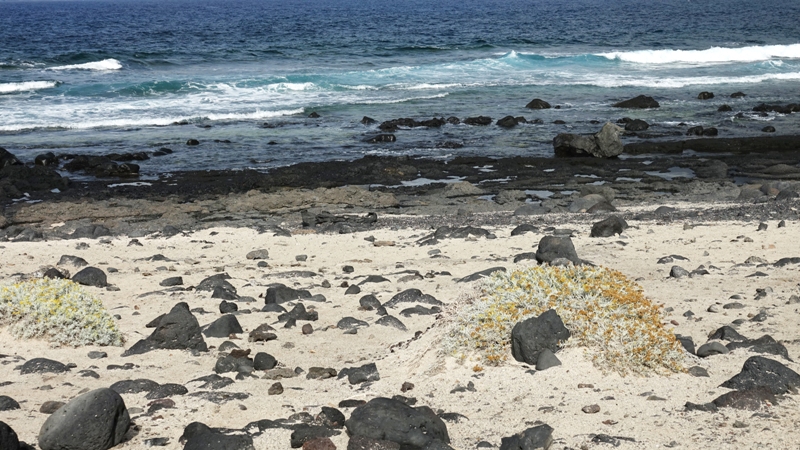 Siguiente parada la Playa de Arenas Blancas, un contraste sorprendente tras la de arenas rojas, en esta ocasión está formada principalmente por fragmentos de conchas de moluscos marinos que le dan el color blanquecino, como podéis observar en las fotografías, combina excelentemente con las rocas volcánicas negras y los cangrejos colorados que circulan por ellas.