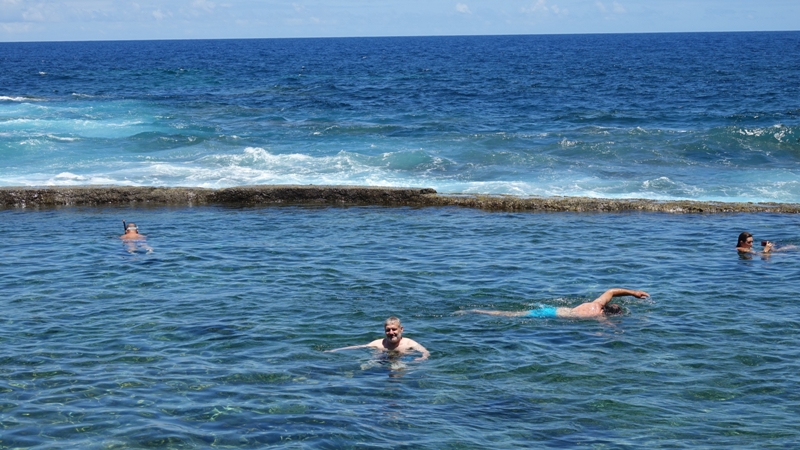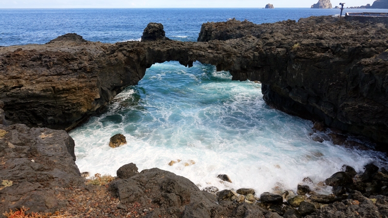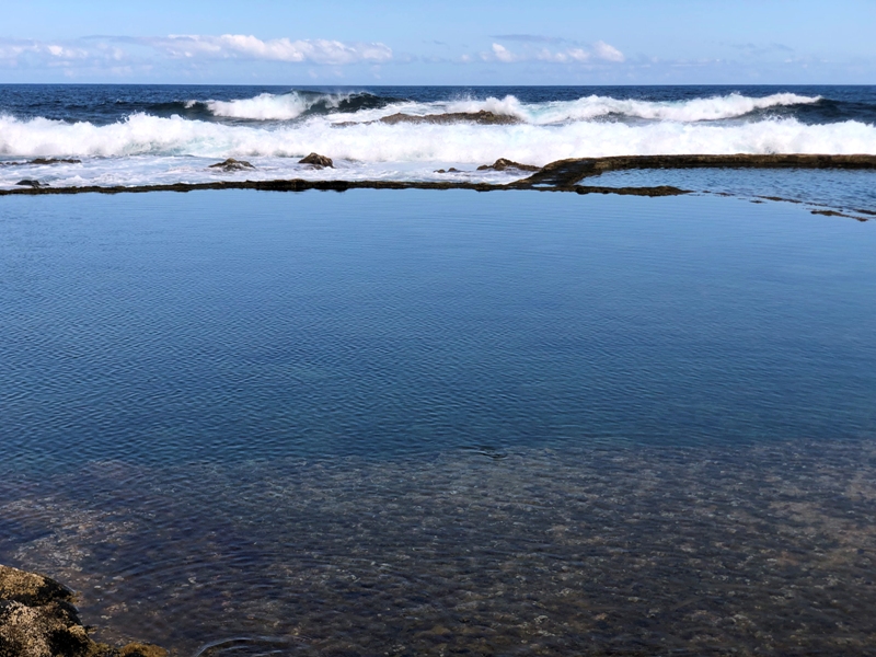 El Charco los Sargos, fue el siguiente de nuestro recorrido, situado a unos 2 kilómetros del anterior, a diferencia de la Maceta apenas ha influido el hombre en su diseño, sus aguas son de un azul turquesa intenso, siempre y cuando el sol incida de lleno, además, el bucólico paisaje lo aderezan dos inmensos arcos de piedra basáltica junto a las piscinas.