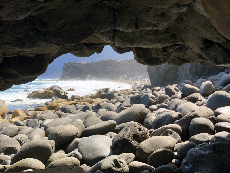Siguiendo la carretera HI-2 en dirección al Parador, pasamos por varias playas de piedras negras, digo piedras porque apenas había arena, como la Playa de las Almorranas donde hicimos varias fotografías a sus cristalinas aguas, el inicio de la playa está junto al Mirador Roque de la Bonanza justo a la salida del túnel.