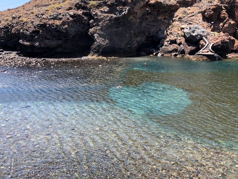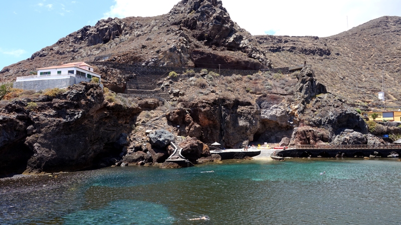 La carretera que desciende hacia la playa de Tacoron, bordea una ladera de lavas rojizas y negras preciosas, obligándote a detenerte varias veces para fotografiarlas. Una vez en la playa, nos encontramos con unas aguas tranquilas de color azul que contrastan con los ocres y negros de la roca volcánica, la zona de baño está dividida en dos parte, con accesos bien acondicionados, además tiene un chiringuito para tomar algo, una cosa extraordinaria en esta isla, donde es a veces difícil encontrar donde tomar un refresco, leímos que muy cerca había una cala de arena roja, pero nosotros no fuimos a verla.