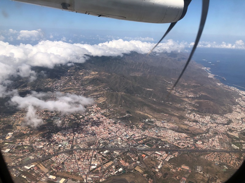 El vuelo a Tenerife tuvo una duración de unos 35 minutos, bajamos del avión para hacer la escala, nos llevaron a la terminal con el bus, pasamos el control de embarque, subimos en el bus y nos volvieron a llevar al ¡mismo avión en los mismos asientos!, y digo yo no podían habernos dejado estar sentados en el avión y no hacer una excursión de media hora para volver al mismo sitio.