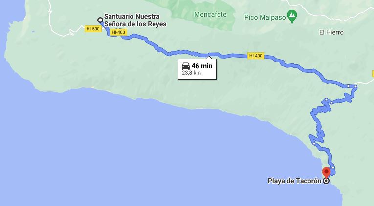 De la playa de Tacorón nos fuimos hacia la Ermita de la Virgen de los Reyes, que por cierto también sale en la serie, la ermita está a una distancia de apenas 25 kilómetros de la playa de Tacorón, pero como la carretera es bastante sinuosa tardamos unos 50 minutos en llegar, contando que hicimos una pequeña parada en el Mirador de Julan.
