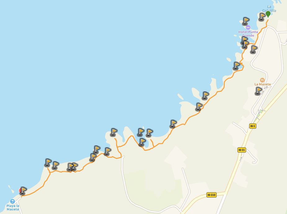 Primero recorrimos el camino hacia la derecha para ver los acantilados junto a las antiguas Salinas de Punta Grande, para a continuación seguir la pista marcada que se dirige hacia la Maceta, el sendero discurre paralelo a la costa a poca altura sobre el nivel del mar, estando la mayor parte habilitado con tablones de madera, el sendero va pasando por varios miradores con estupendas vistas a los Roques de Salmor, recomiendo no olvidarse llevar gorra y protector solar.