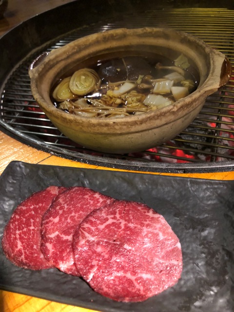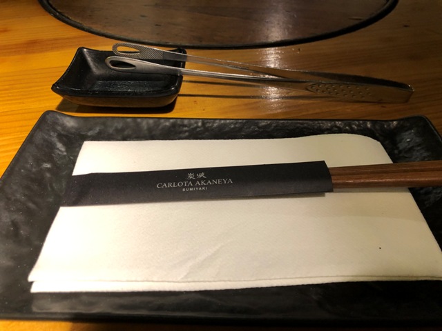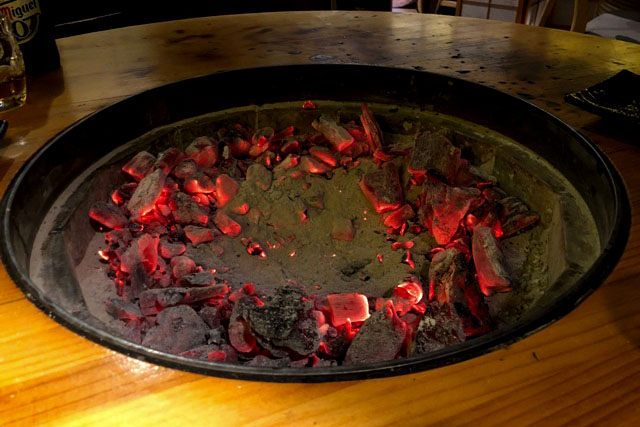 Una vez terminamos los primeros vinieron con una cazo de carbón encendido distribuyéndolo por la barbacoa, dejando un espacio en el centro que es donde debíamos depositar las carnes para evitar que haga humo. El inconveniente es que cuando nos agachábamos para comer sobre nuestro plato se nos asaba la frente, supongo que era porque nos tocó una mesa redonda y la brasa me da la sensación estaba más cerca que en las mesas cuadradas.
