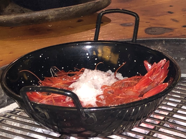 A continuación nos trajeron unas gambas a la sal que las depositaron en un cazo sobre la barbacoa, nos explicaron que esperáramos 5 minutos y ya estarían lista para comer, como no lo entendimos bien, pensábamos que pasados los 5 minutos teníamos que ponerlas en la brasa, pero enseguida nos advirtieron de nuestro error.