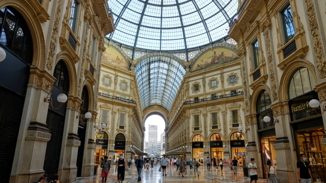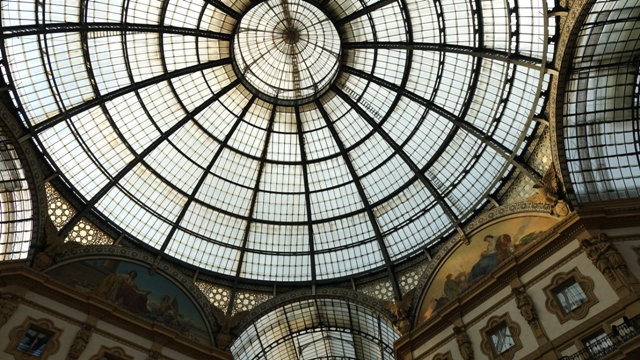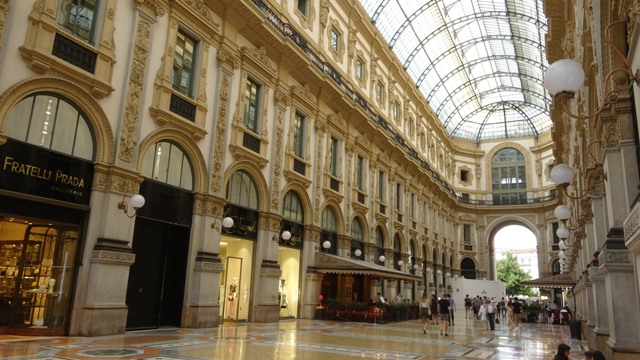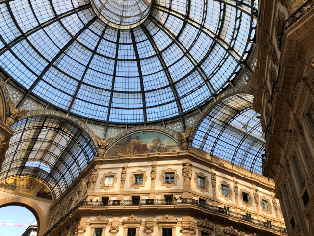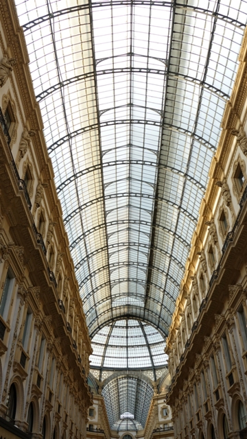 Al terminar la visita de la catedral y dado que están en la misma plaza del Duomo, visitamos las Galerías de Vittorio Emanuele II, al atravesar su imponente arco principal, se nos iba involuntariamente la vista hacia arriba para admirar su preciosa bóveda de vidrio que le da muchísima luz al edificio. En sus amplios pasadizos nos encontramos con varios restaurantes y multitud de tiendas de alta costura y joyerías de reconocidas marcas.