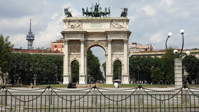 Salimos del parque por la puerta Sempione que nos dejó frente al imponente Arco della Pace, que a mi me recordó bastante a la Puerta de Brandeburgo de Berlín, se construyo en 1807 por orden de Napoleón según el diseño de Vittoriano Viganò, pero tras la derrota de Napoleón en Waterloo se suspendió su construcción, retomándose en 1826 por orden de Francisco I de Austria finalizándose en 1837.