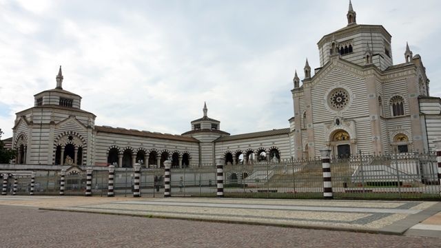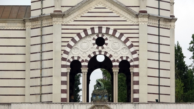 Entramos por su entrada principal a través del gran Famedio , un enorme edificio de estilo neomedieval construido en mármol y piedra formando multitud de líneas horizontales.