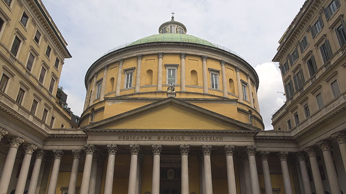 Siguiendo por el Corso Vittorio Emanuele, llegamos hasta la Basílica de San Carlo al Corso, la cual fue diseñada por el arquitecto Carlo Amati, creando un edificio de planta circular con una plaza porticada y en el interior creó una gran nave también circular rodeada de columnas de granito rojo.