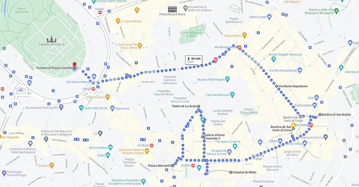 Al llegar a la Via Fatebenefratelli, giramos a la izquierda en dirección al Parque Sempione, por el camino nos encontramos con la Pinacoteca de Brera. También se puede ir hacia el parque por la Via dell’Orso, para no dar tanta vuelta, pero como nos gusta andar hicimos el recorrido largo.