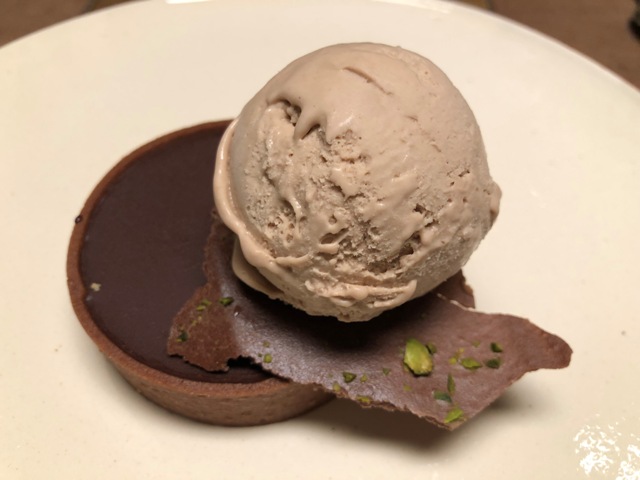 Tartaleta de chocolate con helado de avellanas y pistacho 12€