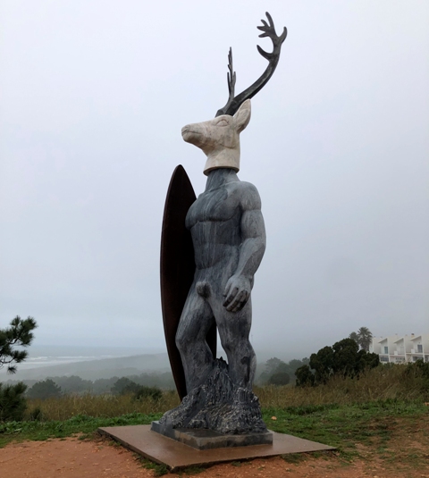 Por el camino nos encontramos con una escultura de un hombre con cabeza de venado cogiendo una tabla de surf.