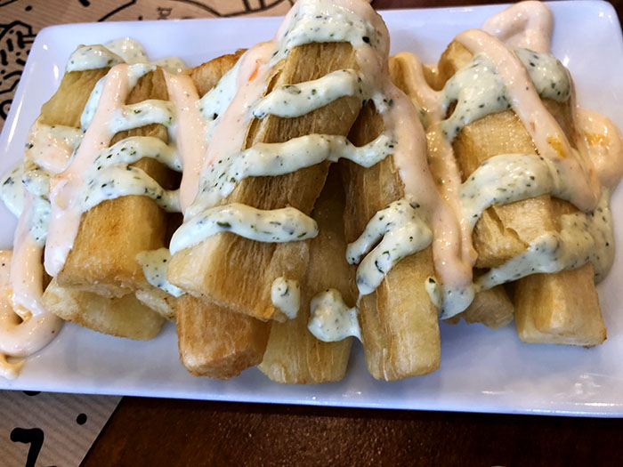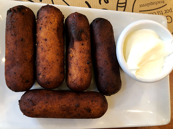 De entrantes : Unas Yuquitas Bravas, unas Arepitas de Chicarrón que me encantaron y Unos Tequeños.