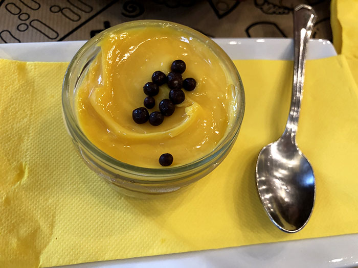 El local está en los bajos de un edificio algo oculto, con una pequeña terraza con apenas tres mesas, que fue donde comimos nosotros y un interior relativamente pequeño con unas 8 mesas, la decoración del interior es de vivos colores amarillos con madera natural dándole un toque exótico.