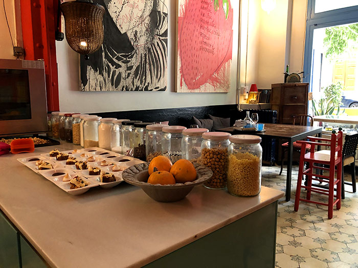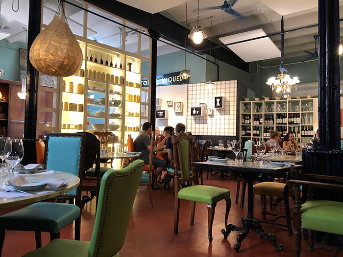 Le entrada del restaurante destila aires del siglo pasado, con una antigua puerta de madera color azul, en su interior nos encontramos con una mezcla ecléctica de estilos y colores, resultando una combinación muy detallista, encantadora y personal. Por lo que sabemos, la gran mayoría de cuadros y decoraciones los realiza en su tiempo libre la mismísima Ada Parellada.