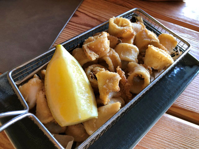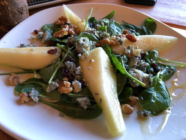 En nuestro caso elegimos de primeros o entrantes, unas patatas bravas, calamares a la andaluza y una ensalada de queso azul ceretano, pera, pasas, nueces y espinacas con vinagreta de miel.