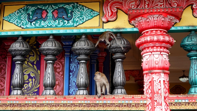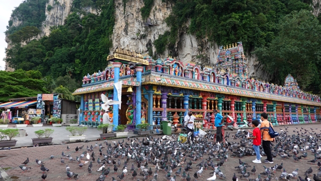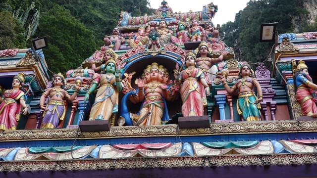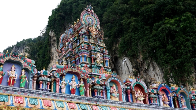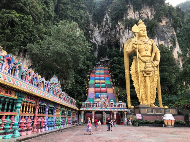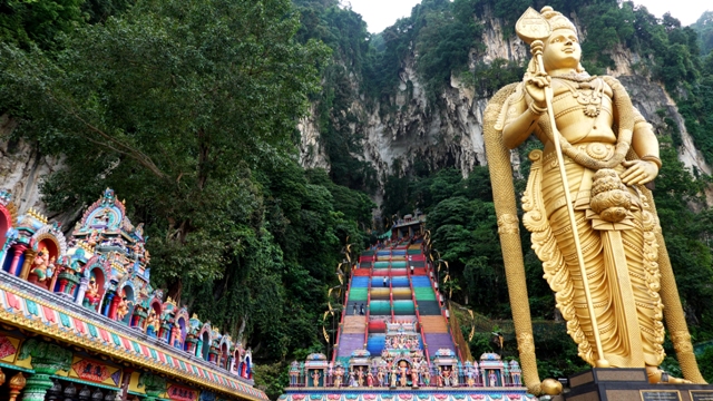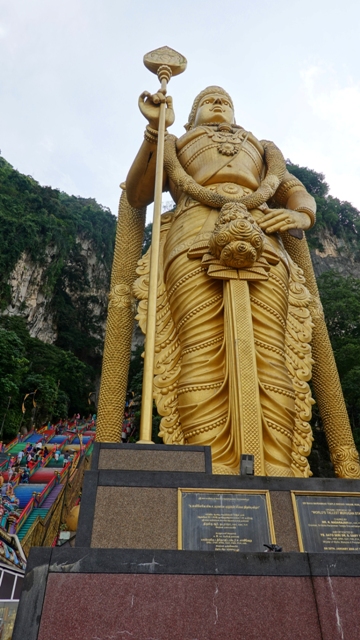 Al pie de las escaleras, encontramos a la izquierda un templo hindú con una gran cantidad de monos recorriendo su fachada y a la derecha de las escaleras de subida se sitúa la enorme estatua dorada del Dios Murugan con sus 42 metros de altura, si os fijáis bien en su mano izquierda tiene un gran panal de abejas custodiando la figura.