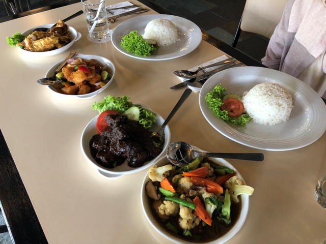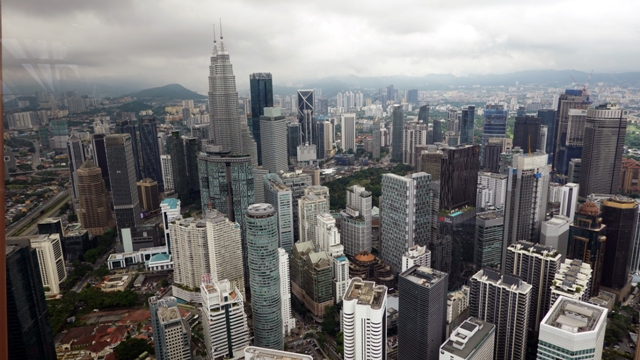 Al llegar el mediodía comimos en el restaurante Atmosphere 360º situado en la torre KL, que a pesar de ser unos metros más baja que las twin towers, como la construyeron encima de una colina realmente el mirador está mucho más alto, ofreciéndonos las mejores visitas panorámicas de Kuala Lumpur, con las Torres Petronas relativamente cerca junto con el nuevo rascacielos llamado Merdeka 118 (Independencia 118) que tiene 118 pisos y su aguja a 679 metros de altura, más al fondo también se pudimos apreciar perfectamente la Torre Exchange 106, con 106 pisos y 492 metros de altura, una guerra sin cuartel a ver quien hace el rascacielos más alto.