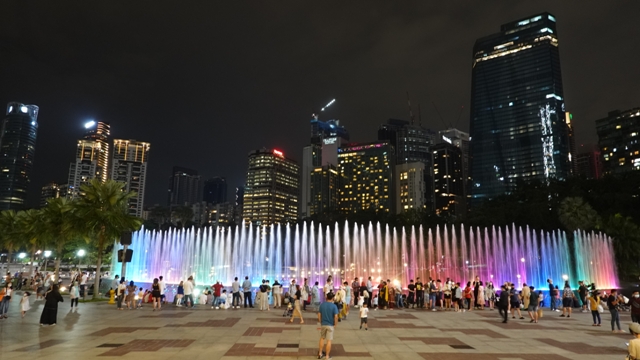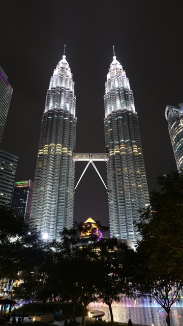 Una vez cruzamos la puerta de acceso al parque, nos quedamos frente a la fuente completamente rodeados de rascacielos, destacando sus protagonistas, las Twin Towers Petronas, me dio la impresión de estar en Singapur, salvando las distancias claro, pero los edificios iluminados con sus fuentes de colores frente a ellos, me dejó esa sensación.