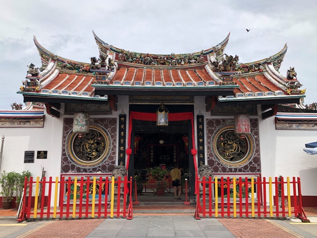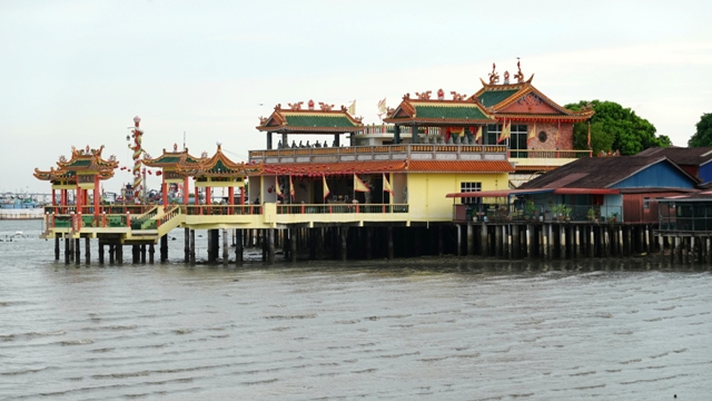 Volvimos sobre nuestro pasos para dirigirnos hacia otra pasarela que nos llevaría hasta un enorme templo situado casi al final del Chew Jetty, llamado Hean Boo Thean Kuan Yin Temple, también construido sobre el mar con pilares y pintado de amarillo canario y rojo, es imposible no verlo, por la noche lo iluminan con cientos de bombillas, fue construido en 1972 y restaurado en 2012. Muy cerca pudimos ver un pequeño templo hinduista.