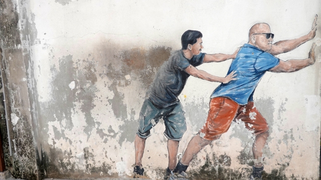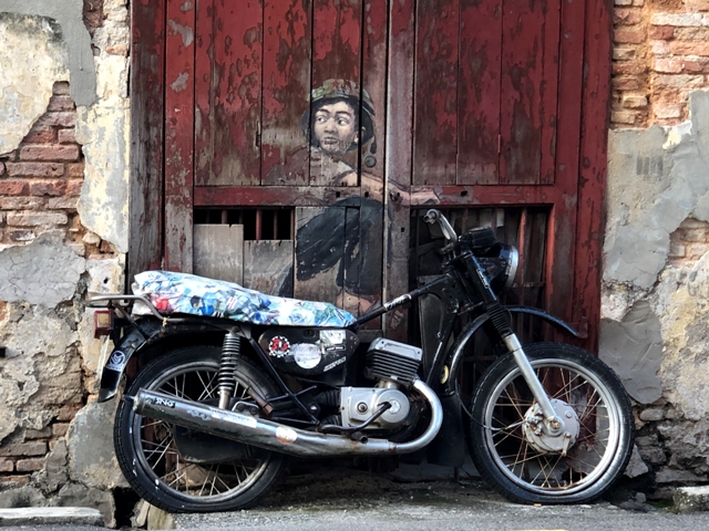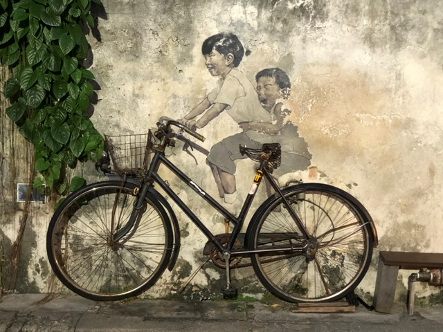 Aprovechando nuestro paseo por el casco histórico fuimos en busca de sus famosos murales de arte urbano, un encargo que hizo el Gobierno de Penang a un estudio de arte para decorar algunas de sus calles, para ello mezclaron objetos tridimensionales de acero , como una bicicleta o una moto vieja para pintar a niños jugando con ellas, es una lástima que algunos ya están bastante deteriorados, pero como podéis ver en las fotos son auténticas obras de arte, según he leído hay 52 murales por todo el casco antiguo, nosotros apenas vimos un par de decenas.