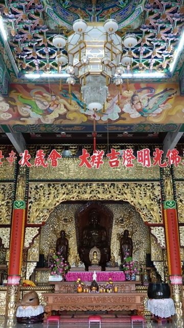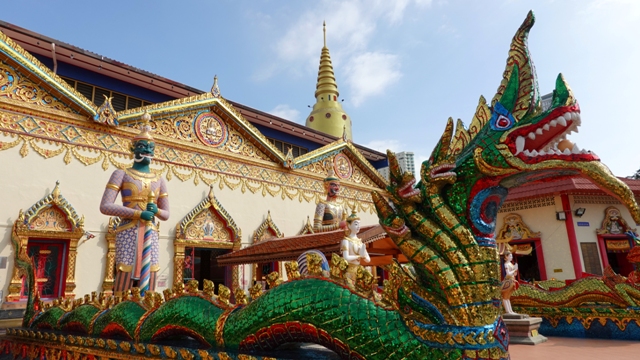 Como es el primer templo de estilo tailandés que hemos visitado, nos sorprendió su brillo, gracias a la gran cantidad de cristales coloreados, placas doradas y coloridos dragones, como suele suceder la primera vez que ves algo, nos hinchamos a hacer fotografías.