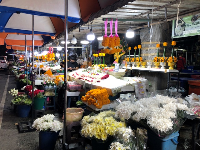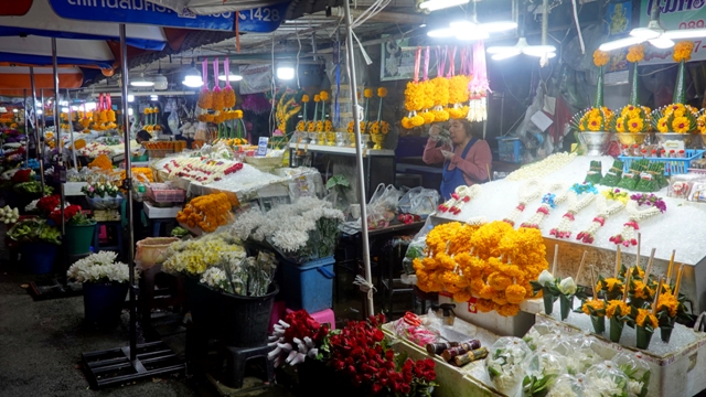 Para regresar a la zona del casco histórico, cruzamos un puente peatonal llamado Chansom Memorial Bridge (Khua Khaek), que nos dejó frente al mercado de las flores en la calle Praisanne Rd., en el barrio chino, una explosión de color en mitad de la ciudad.