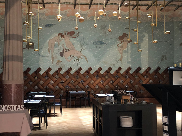 Hicimos la reserva a través de la app The Fork que en ocasiones se puede encontrar con algún descuento interesante. El restaurante está alojado en un maravilloso salón comedor de estilo modernista catalán, el cual fue proyectado y decorado por el ilustre arquitecto Lluís Domènech i Montaner, la verdad es que mientras estábamos comiendo no podíamos dejar de admirar los precioso detalles de la sala, desde los elaborados techos pasando por la decoradas paredes y suelos.