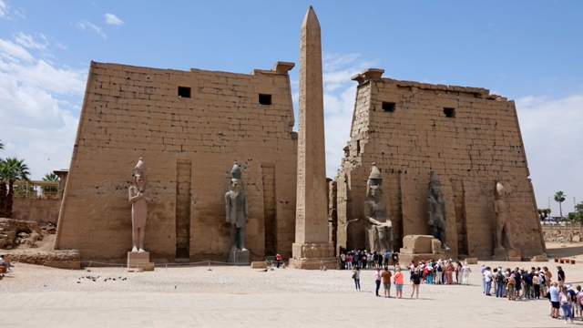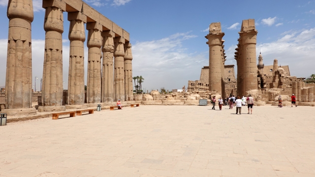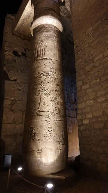El recorrido nocturno por el templo de Luxór lo iniciamos por el Primer Pilono junto al Obelisco y los seis colosos de Ramsés II, pasando hacia La Corte de Ramsés con sus elaboradas columnas, la gran columnata de Amenofis III hasta la sala de la barca de Alejandro Magno.