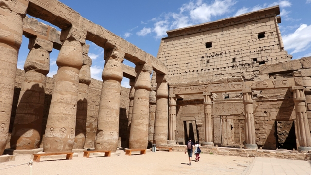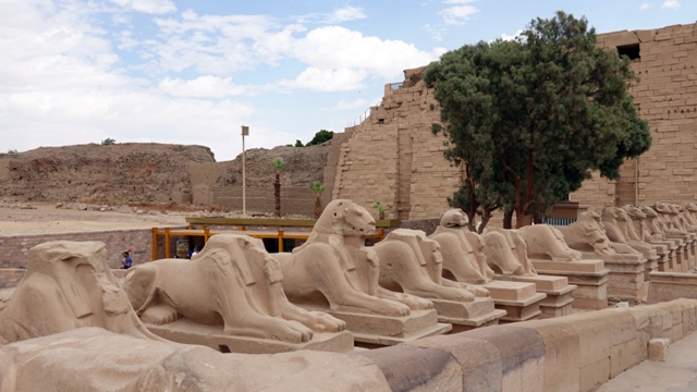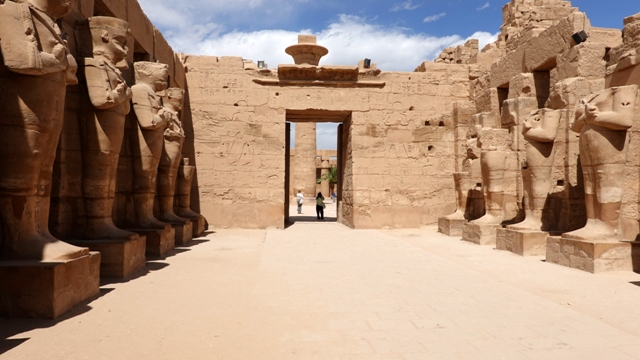 Al descender del bus y una vez superada la entrada al recinto con su correspondiente control de seguridad, atravesamos la Avenida de los Carneros, también conocida como los Dromos de Karnak, que nos llevó directamente al monumental acceso a los templos, donde nos encontramos con la zona de los templetes, visitamos el de Seti situado en el lado izquierdo.
