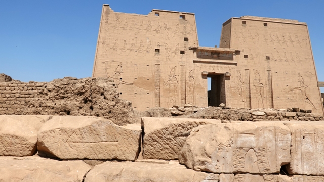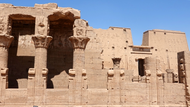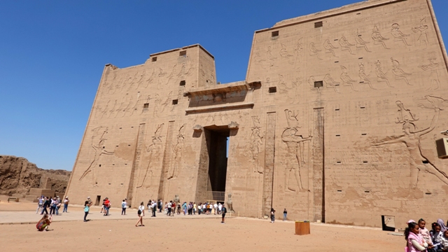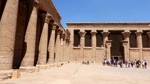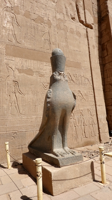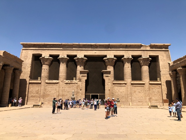 El Templo de Edfú está dedicado al dios Horus con su forma de halcón, nos dijeron que es el mejor conservado de la época grecorromana,  fue construido entre los años 237 a.C. y 57 a.C, en pleno periodo helenístico por orden de Ptolomeo III, continuando su construcción su hijo, Ptolomeo IV, siendo terminado finalmente por Ptolomeo XII.