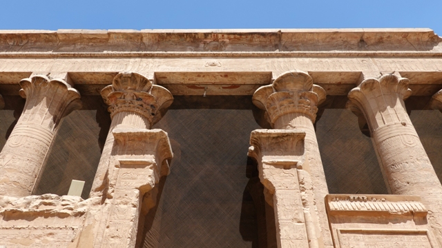 Las inmensas columnas están construidas en bloques redondos de piedra tallada, rematadas con elaborados capiteles que simulan la planta del papiro, además están preciosamente decoradas con relieves polícromos, que aún se conservan en bastante buen estado actualmente.