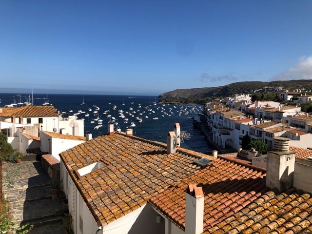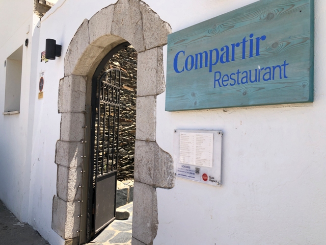 Llegamos a Cadaqués con una media hora de antelación, pero para nuestra sorpresa había una larga caravana de coches intentando entrar en los aparcamientos de pago, que resultaban estar cerrados con una valla y con un policía controlando porque estaban al completo, lo que obligaba, una vez hablabas con el policía a dar media vuelta, por suerte le explicamos al poli que teníamos una reserva en el restaurante Compartir y nos dejó pasar la valla, pero seguíamos en una larga cola de coches esperando que saliera alguno del parking para entrar el siguiente.